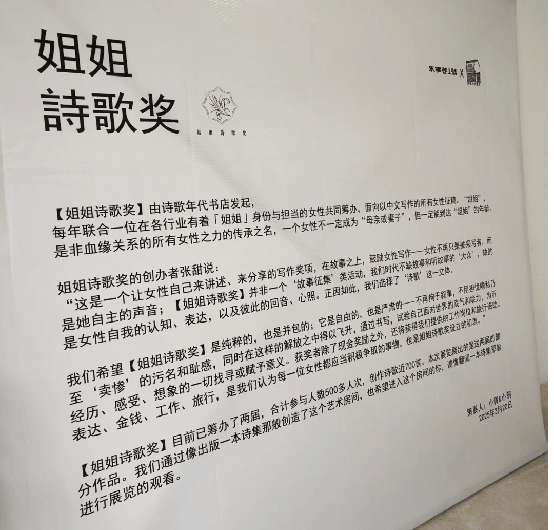 “姐姐诗歌奖”是一个鼓励女性书写与表达的诗歌平台,两届里汇集了来自500多位女性的上千首原创诗歌和书信,她们是外卖员、家政工、学生、母亲等,作品源自真实生活。两年来,姐姐诗歌奖的展览已走过十多个城市,我们期待通过这些作品,见证女性真诚的自我叙述与生命力量,持续为女性提供表达与连接的空间,让书写照见女性的生存与尊严。这是她们的诗在北京书展第一次亮相,欢迎来提笔和她们一起书写!
