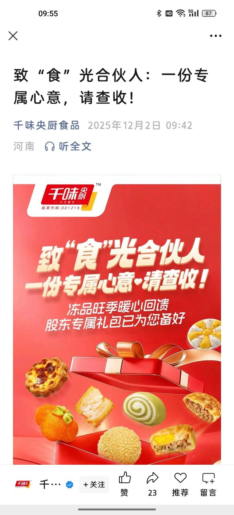 之后到现在,上市公司回馈股东的案例越来越多,例如在12月1日,千味央厨(001215)就发布公告,开展“股东回馈活动”,只有拥有100股,那么股东就能领到价值200元的公司产品礼包。之前万达电影(002739)和博纳影业(001330)的股东,就是可免费领取价值200元—400元不等的电子观影券礼包,或者以专享优惠价格购买观影券礼包。