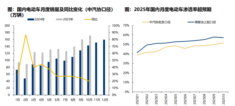 纯电及插混销量同增幅度均较大,纯电占比提升至60%。25年1-10月,纯电销量833.2万辆,同比+43%;而插混销量458.4万辆,同比+17%。25年1-10月,纯电占比65%,同比+5pct,插混占比35%,同比-5pct。