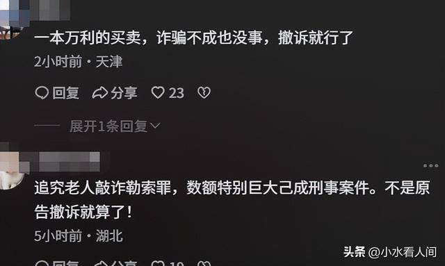 有人认为老人就是在敲诈,是在诈骗,不能撤诉就解决了,应该给大众一个更满意的说法,不然以后有人学这种坏行为。