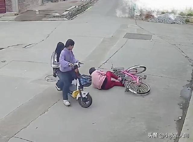 两个女孩慢慢骑到老人身边,商量着扶不扶,可是听到老人的求救声,女孩还是下车了。
