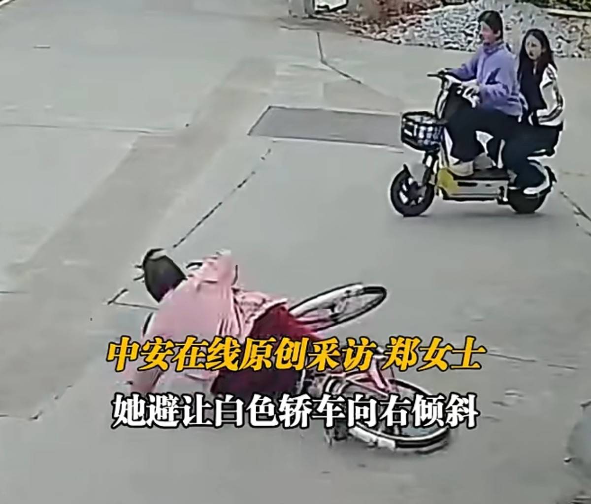 当老人从白色轿车旁经过后,路口处又出现了两个骑电动车的小女孩,老人随即便一副重心不稳的样子,紧接着连人带车摔倒在地。