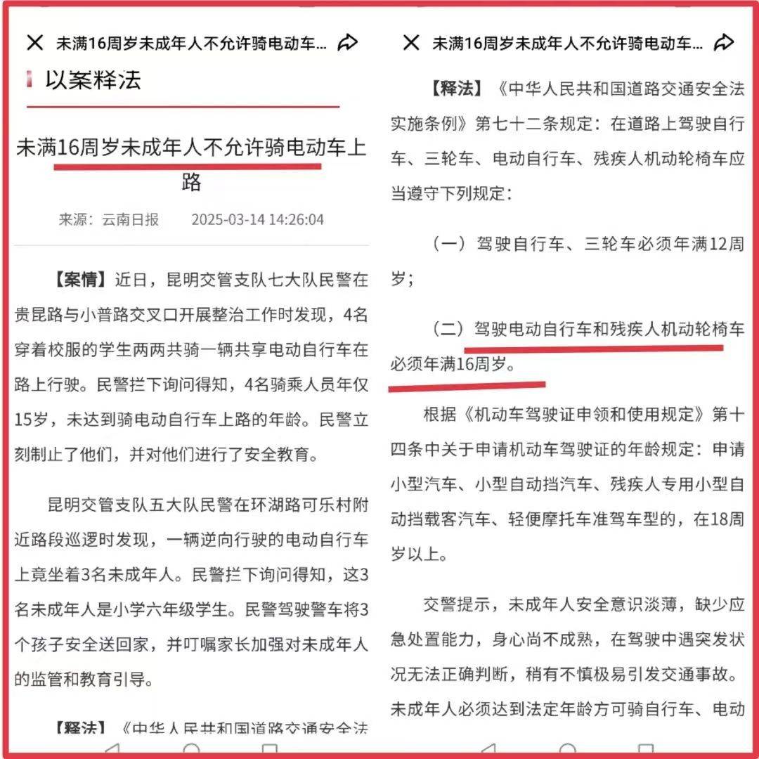 没满16岁不能骑电动自行车上路,这是孩子们先踩了红线,要是还违规带了人,那错得更明显。