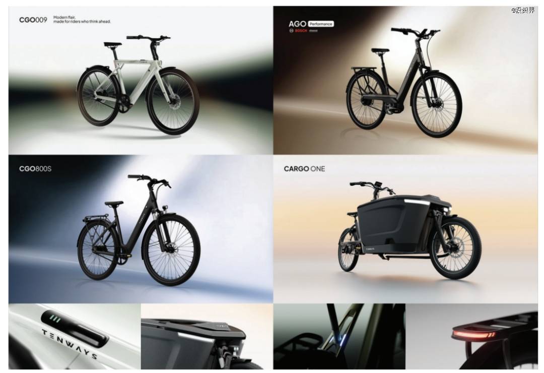 招股书显示,目前TENWAYS产品涵盖综合品类的电助力自行车系列,包括城市型、混合型与运载型车款,是欧洲少数具备全系列产品线的品牌之一,满足了欧洲各地广泛的应用场景,包括城市通勤、越野探险、家庭运输及载货。其售价在1799欧元与4999欧元之间不等,即一辆售价区间大约14500-40000元人民币。