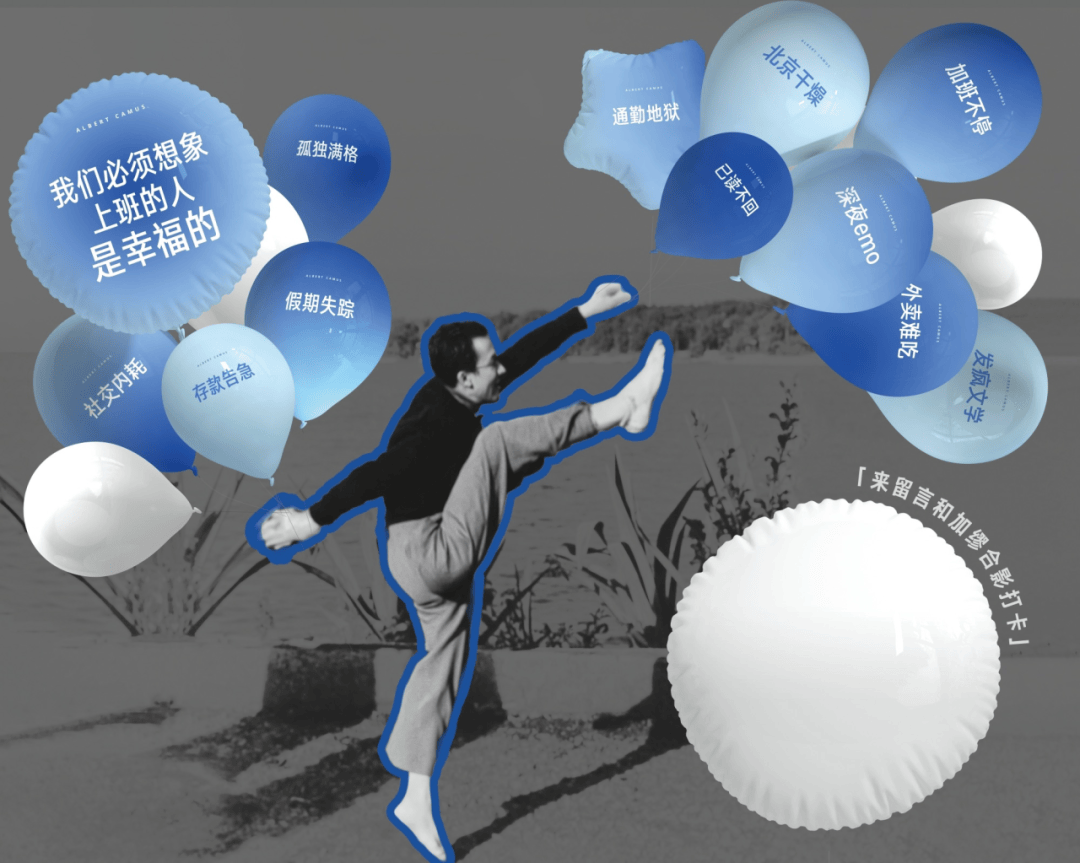 「我们必须想象上班的人是幸福的」,取自《西西弗神话》那句著名的论断“我们必须想象西西弗是幸福的”。