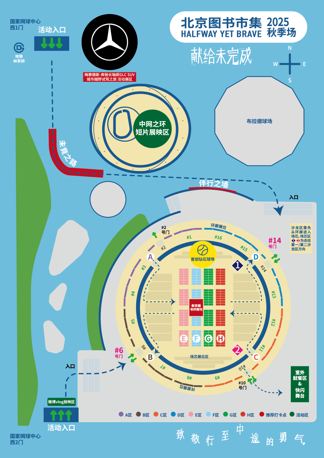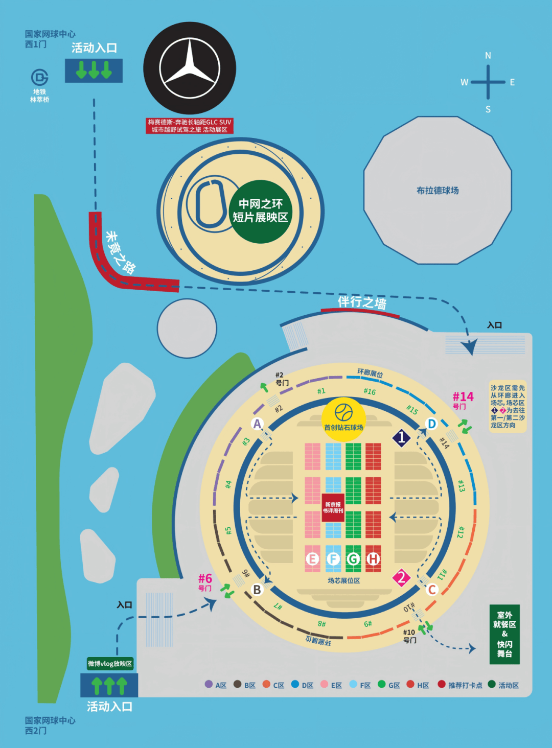 本次沙龙在国家网球中心有两个区域,需到一层场芯层,根据指示牌指引前往。二层环廊无法前往。详细位置亦可查看市集手册,手册入场即可领取。