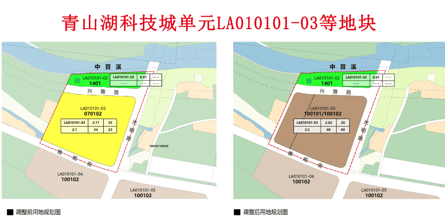 青山湖科技城单元LA010101-03等地块主要调整内容:主要涉及用地性质调整,将原来的二类城镇住宅用地调整为一类工业兼容二类工业用地。住宅原先用地面积为2.71万㎡,按照容积率2.1测算,预计住宅建面减少5.691万㎡。