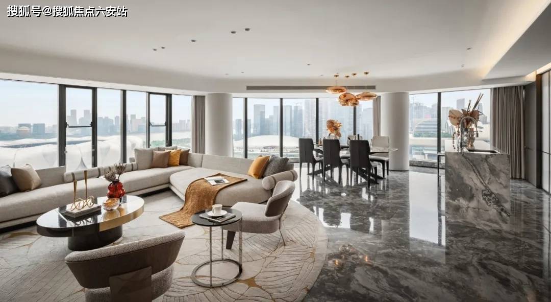 建筑立面采用钛钢一体化成型工艺与意大利卡拉拉白大理石,以杭州玉琮为灵感,通过270°环幕采光窗与4.3米层高设计,将钱塘江景与城市天际线%得房率重新定义豪宅标准,其反重力立面美学与科技感线条,成为奥体中心最具未来感的建筑语言。