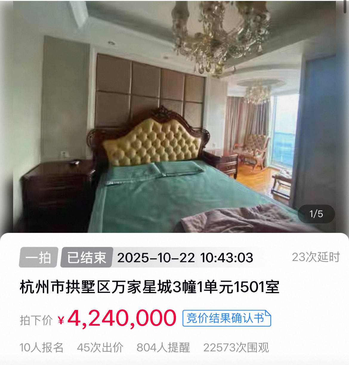 今天,一套建筑面积128.94㎡的万家星城房源在法拍平台拍卖。作为一个交付已经超过10年的老盘,这套房源仍然吸引了2万多人次围观,热度非常高。拍卖阶段,有10人报名参拍,最终以424万元成交,折合单价约3.29万元。