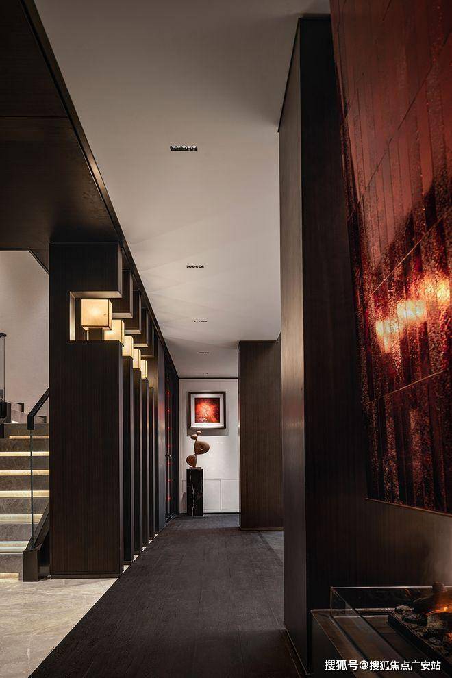 一层的平面是「曲尺型」的布局,客餐厅之间以游廊相连,客厅与餐厅以斜45°角的对望关系存在, 中间以内庭水景相隔,巧妙地解决了室内与室外之间的渗透关系。它能带给你心灵上的自由、行动上的自由,这才是真正住别墅的一种意义。