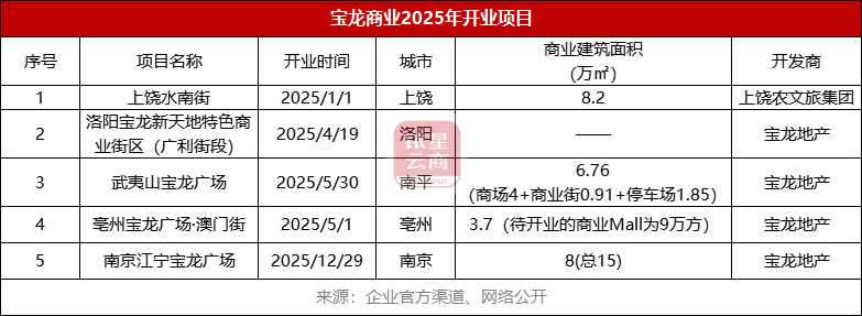 在2025年,宝龙商业分别在福建南平、江苏南京新开一座宝龙广场,在江西上饶开出文商旅街区上饶水南街;并将洛阳宝龙新天地广利街段商业街提升焕新;旗下亳州宝龙广场·澳门街也先于商业Mall亮相。涵盖大型商场、特色街区等不同形态。