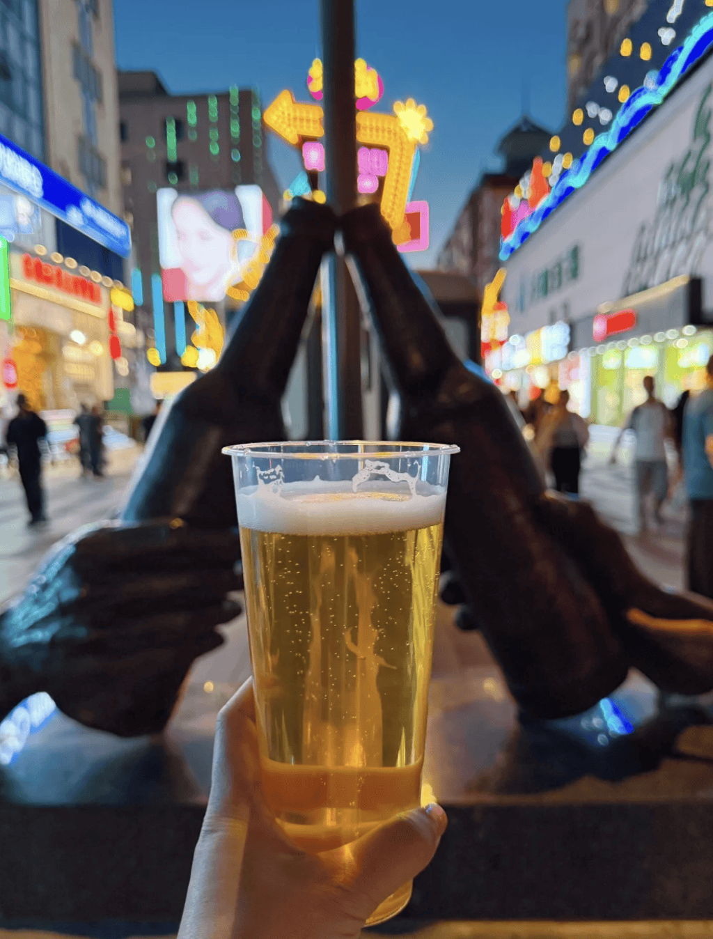 夜幕降临时,整个街区霓虹闪烁。主干道上,巨型青岛啤酒交易所的智能啤酒柱吸引着游客驻足,屏幕上不同口味啤酒的“股价”实时跳动,你可以像操盘手一样“抢购”一杯,趣味十足。
