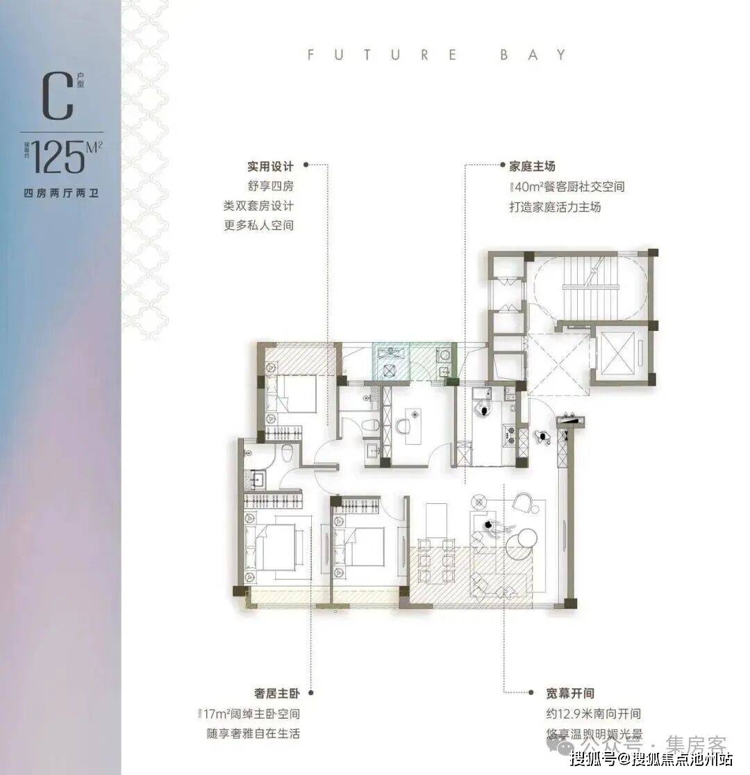 餐客厅开间6米,面积达到约60方,媲美200方大平层居住体验,主卧采用270度飘窗设计,可更好的提升主卧采光及景观。